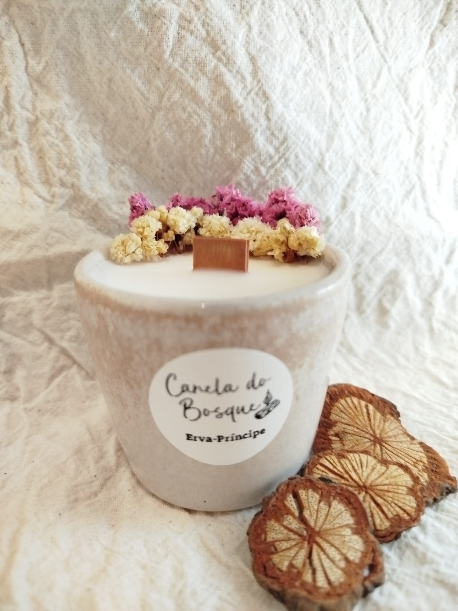Ingredientes: cera de soja, óleo essencial de erva-príncipe (100% puro), pavio de madeira