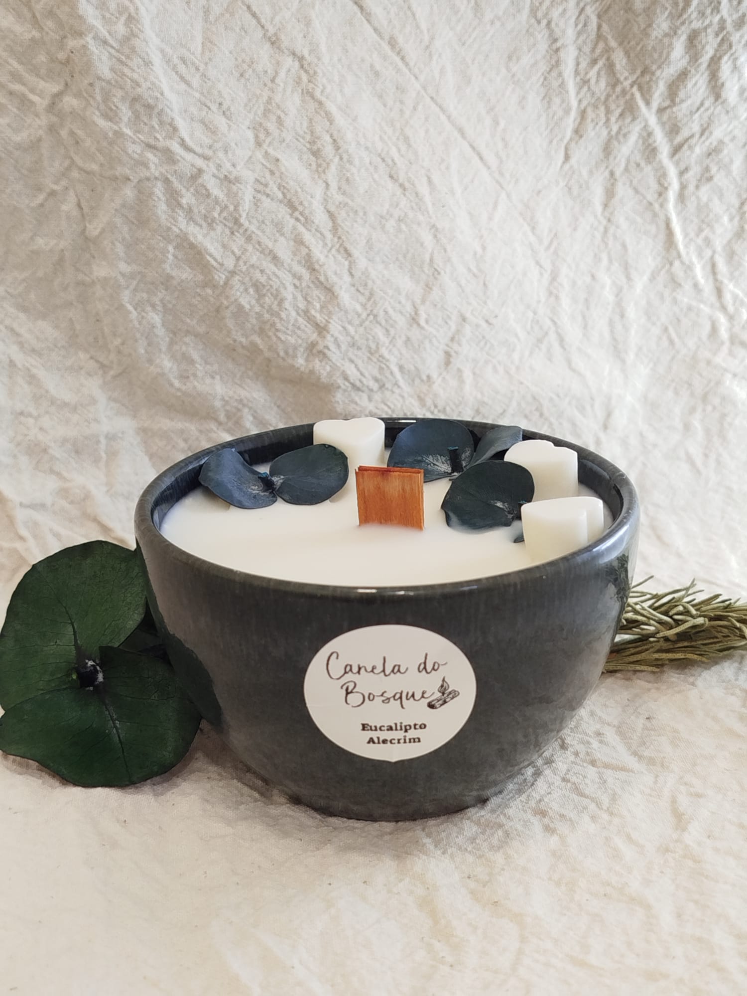 Ingredientes: cera de soja, óleos essenciais de eucalipto e alecrim (100% puros), pavio de madeira